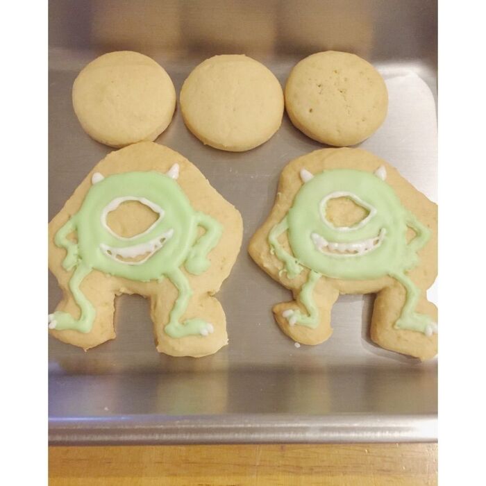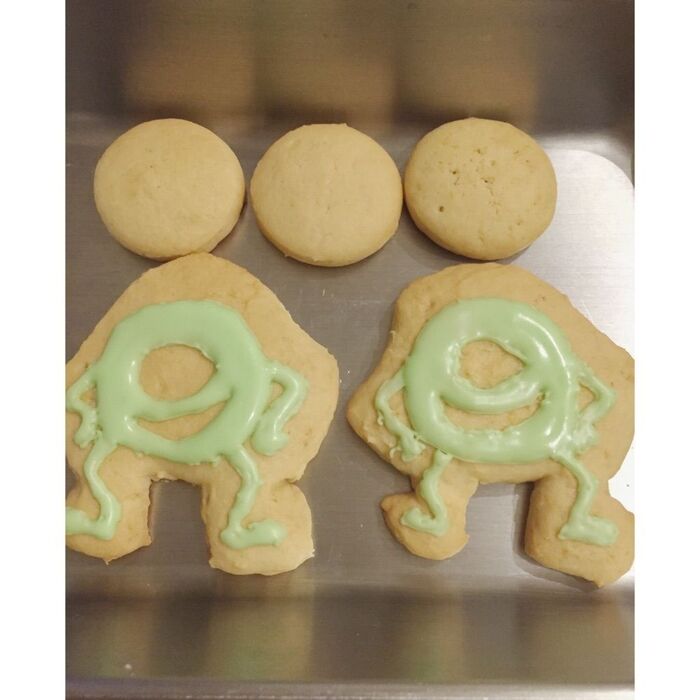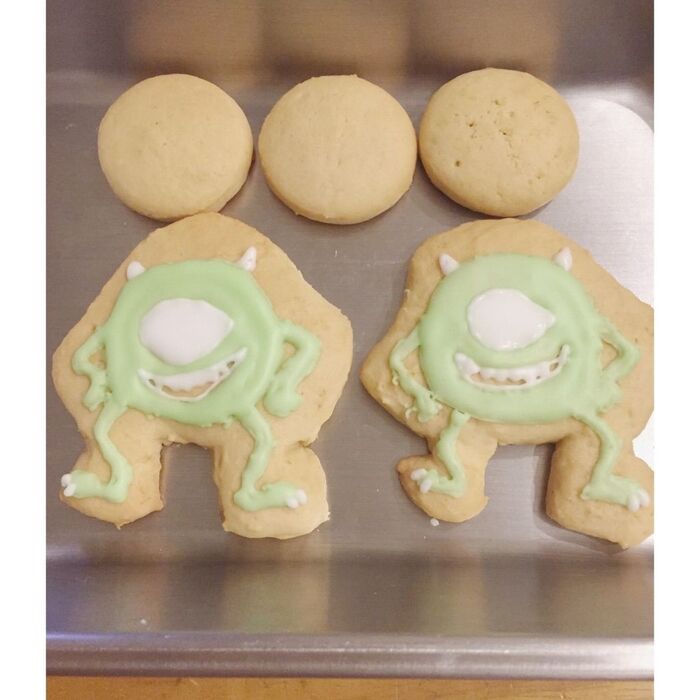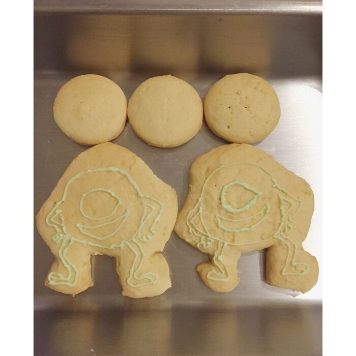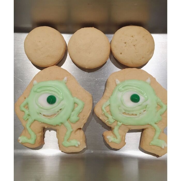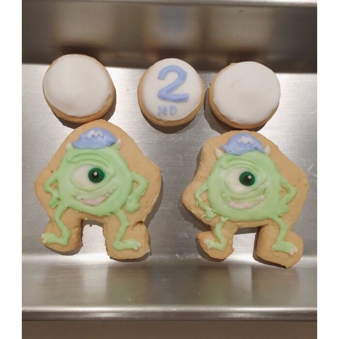 ▲数字用の丸いクッキーは白のアイシングを輪郭→面の順で描き、乾いたところで数字を描きました。マイクは帽子と目玉の輝きを描いて、完成です!!