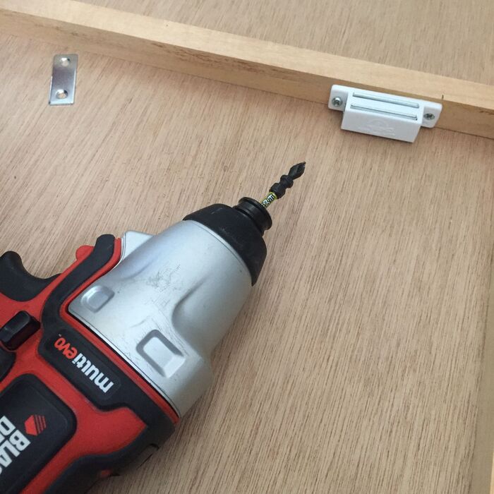 扉の開閉には、ホームセンターで購入した、マグネットを使います。蝶番を使った開閉を検討しましたが、パネルの開け閉めに場所を要するため、取り出したいものが入っている場所の扉のみを外せるような設計にしました。
