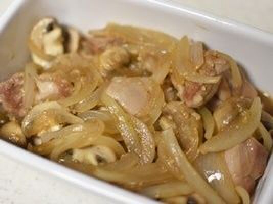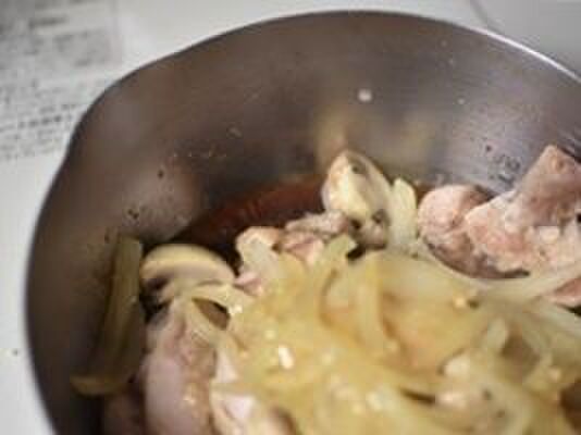 玉ねぎは繊維にそって薄切りにし、マッシュルームは半分に切る。1に加え炒め合わせる。酒を加え蓋を蒸し焼きにする。