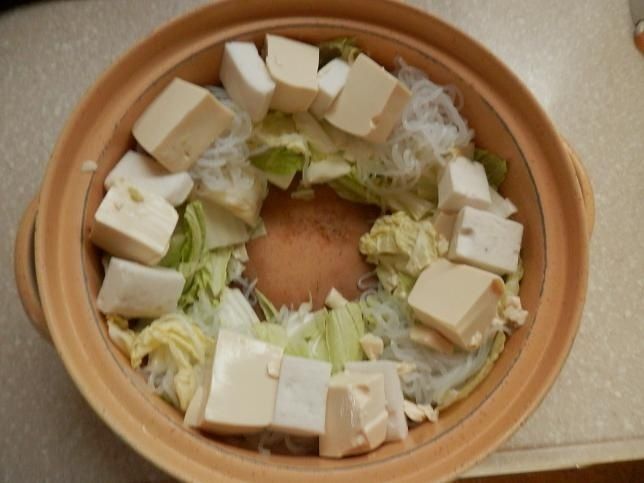 鍋に白菜をドーナツ状に敷き、白滝、はんぺん、豆腐をバランスよく並べます。