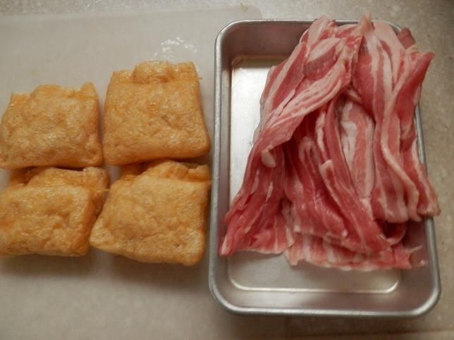 豚バラ肉は長さを半分にします。油揚げと餅を半分に切り、油揚げの中に餅を入れてパスタで口を止めます。