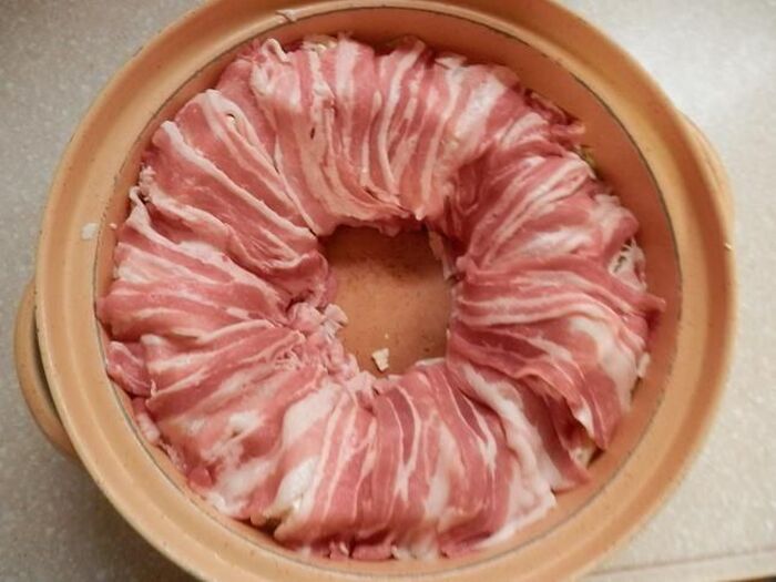 豚バラ肉を隙間なくかぶせて、真ん中に持ち巾着を入れます。市販の鍋つゆの素(ストレート)を注いだら完成♪