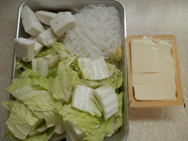 白菜はざく切りに、豆腐とはんぺんは8等分に切り、白滝は長さを半分くらいに切ります。