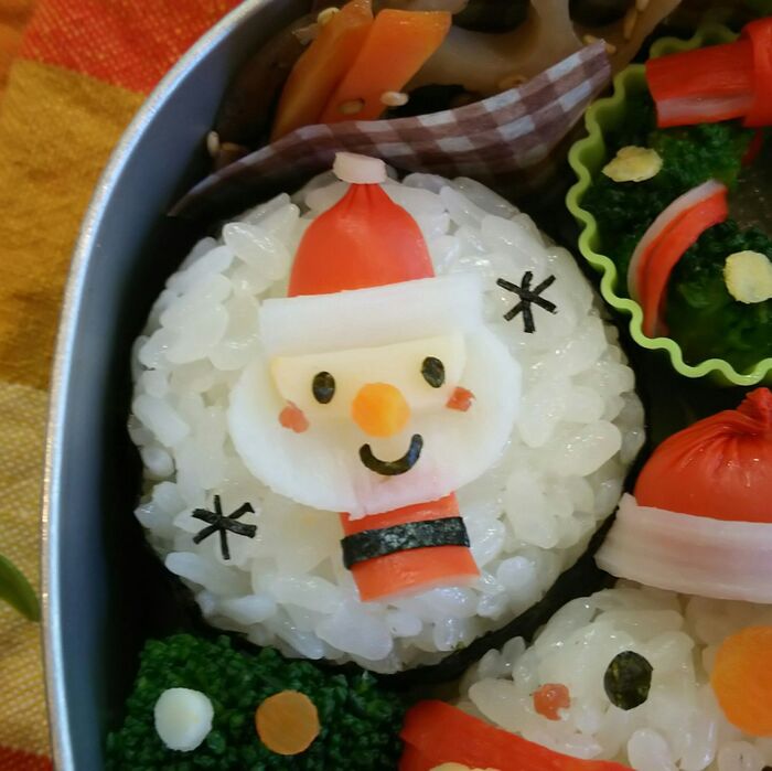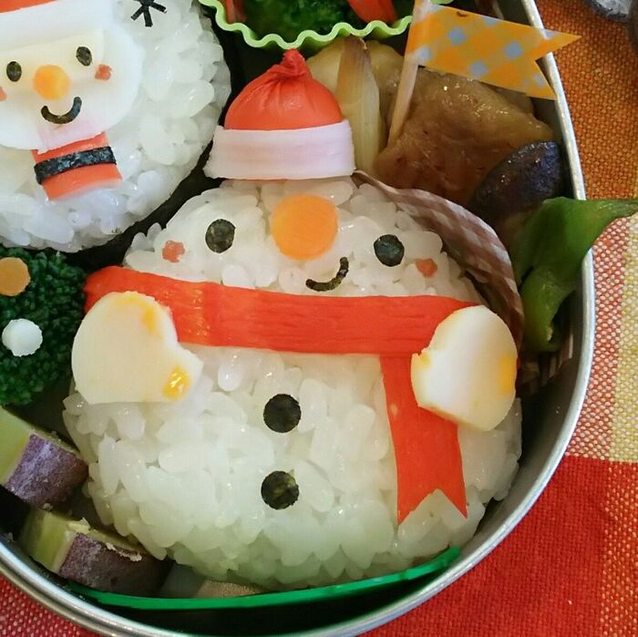 ①ごはんでサンタの土台とスノーマン(ほんのり卵形)をそれぞれ握る。
