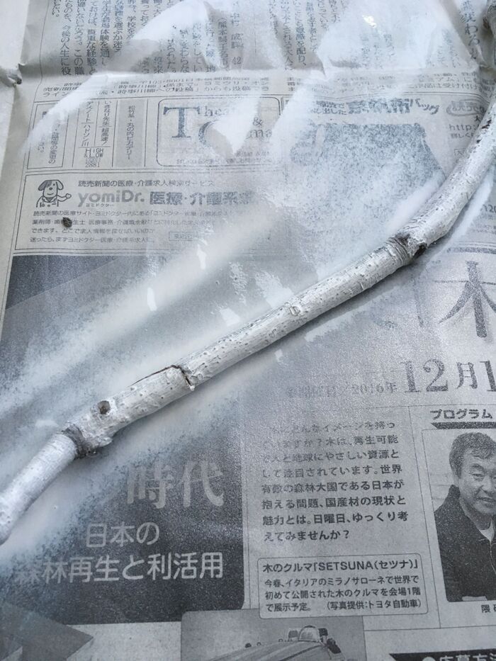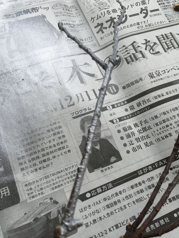 こちらがシルバースプレーで色付けした枝です。白に比べるとわかりづらいですが、綺麗に色付けできます。