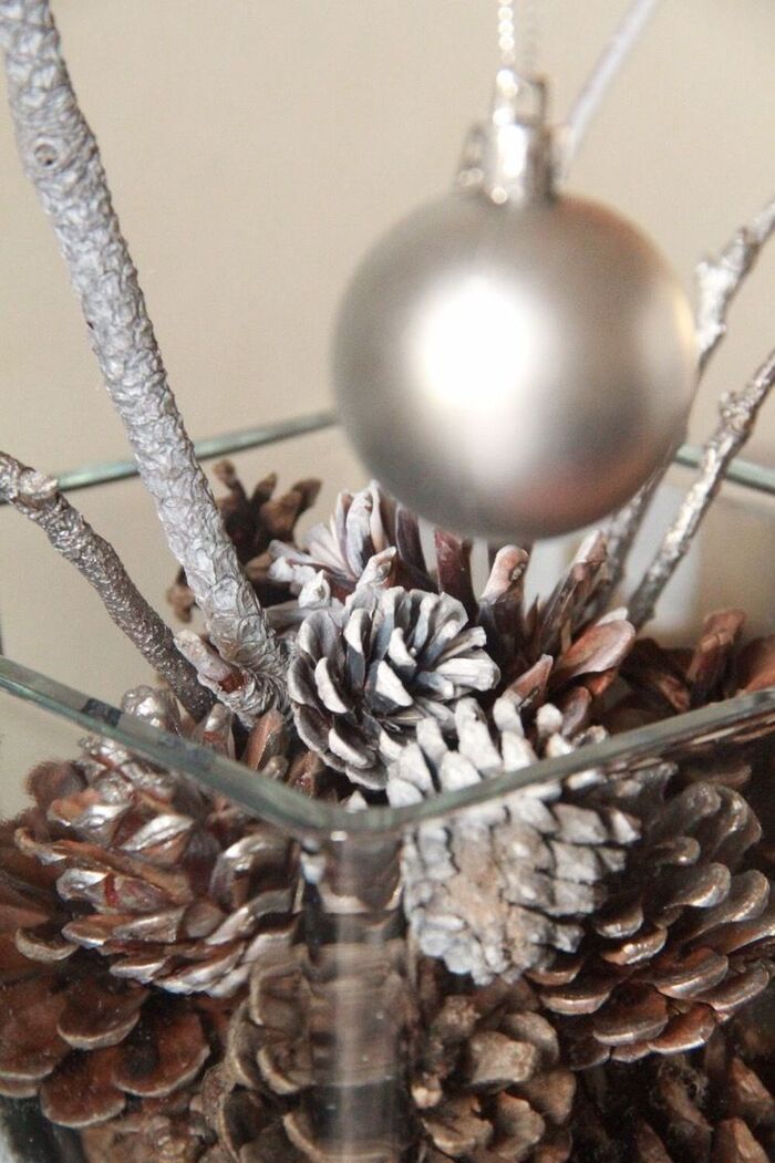 小さな花瓶なら枝だけでも良いですが、大きい花瓶に枝だけだと崩れてしまうので、松ぼっくりを剣山がわりにしてさしていきました。