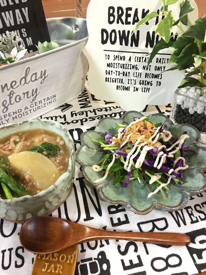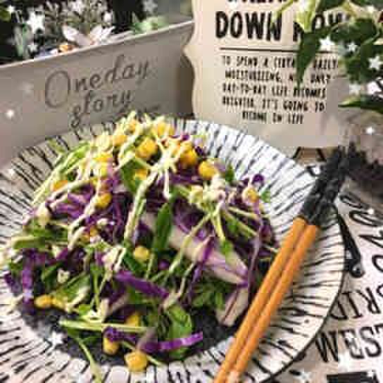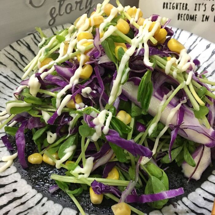 シャキシャキで甘い紫キャベツと栄養たっぷりの豆苗にコーンの優しい甘さでアクセント!