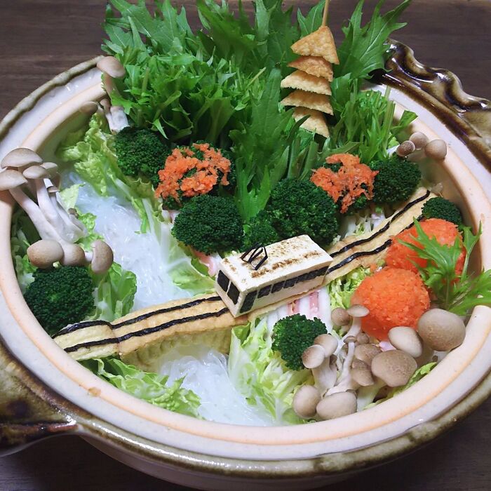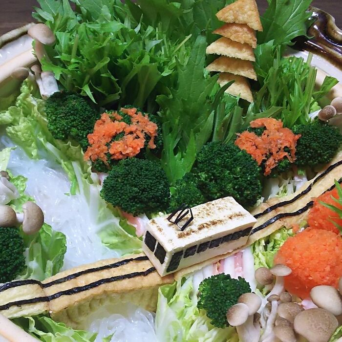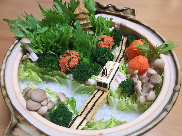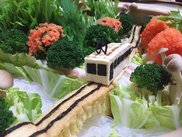 ブロッコリーに人参おろしを貼り付けて紅葉を表現します。焼き豆腐の電車を設置したら、できあがり。