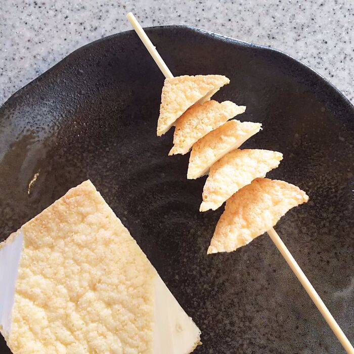 ③焼き豆腐に平行に差し込む。