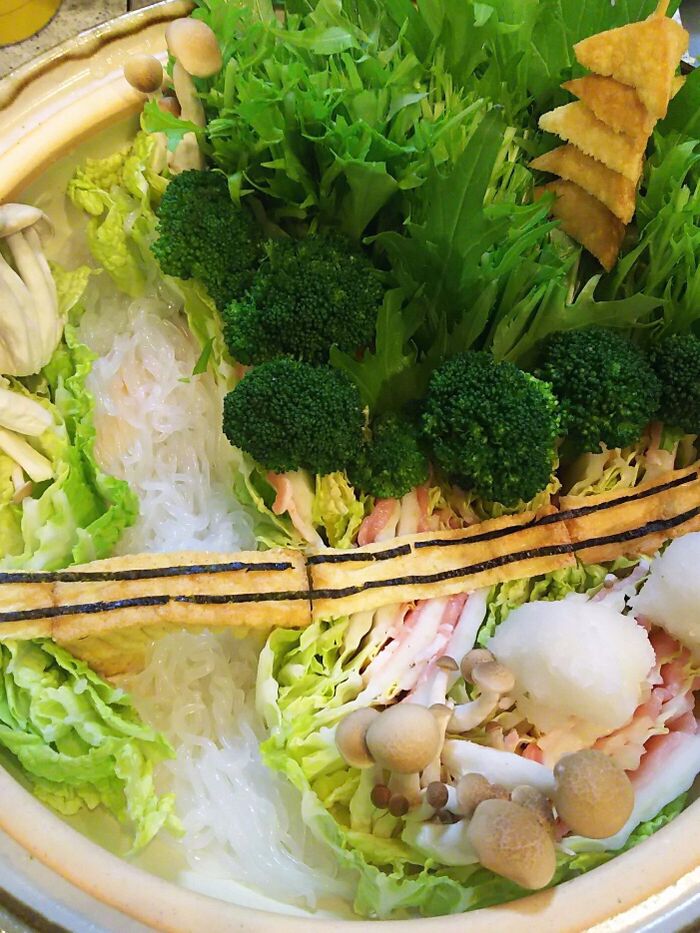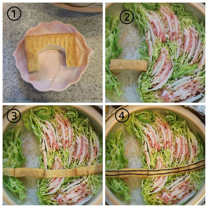 ②白菜と豚肉をミルフィーユ状に敷き詰める。川の部分をあけ、鉄橋を挟み込む。