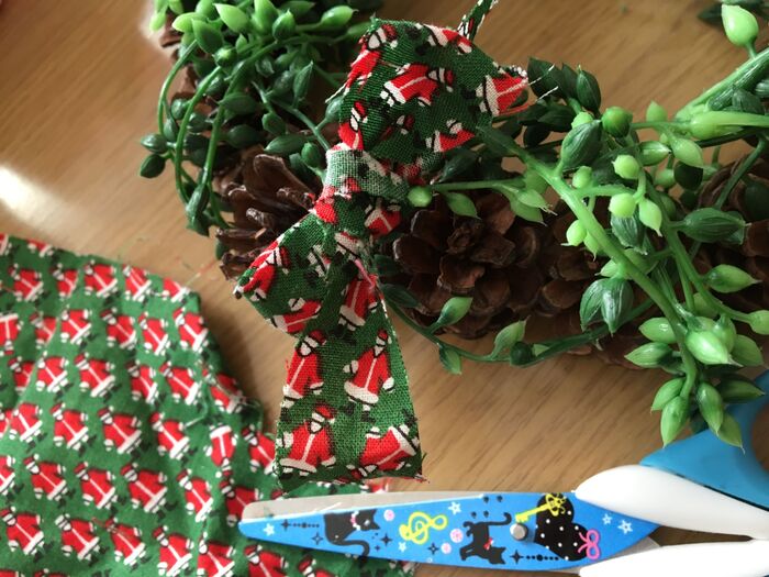 長ぐつ飾りをまつぼっくりにひっかけるだけで完成!