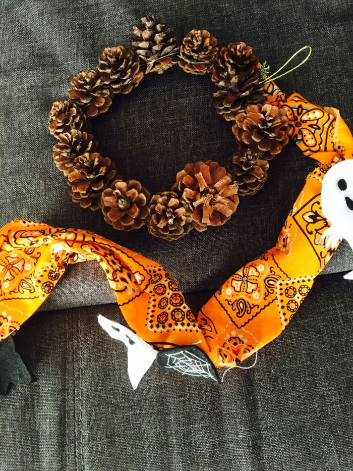 こちらは使わないオレンジのペイズリー柄スカーフを巻きつけて、そこにフェルトで作ったおばけちゃんやコウモリなどをつけただけです♫