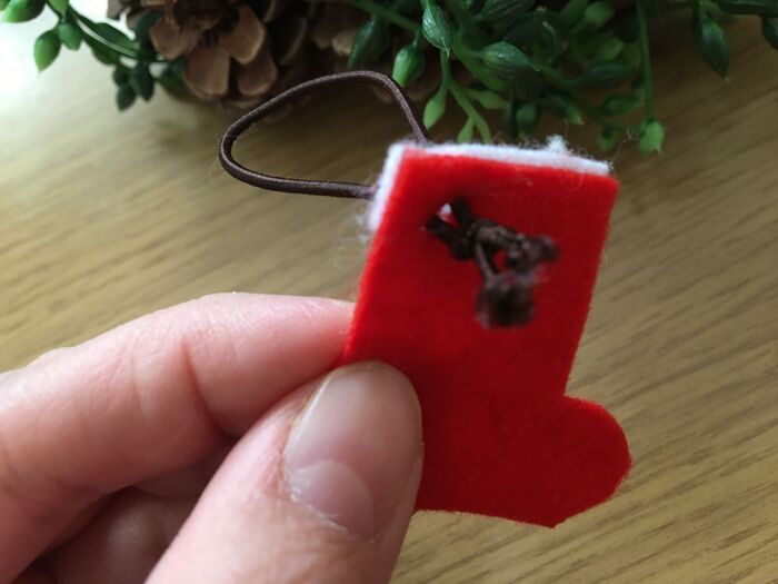 そして長ぐつ型に切ったフェルトを作り、(赤い部分と白い部分は両面テープで貼るだけ)目打ちや針、ボールペンなどで軽く穴を開けて、そこに細いヘアゴムや糸などを通します。