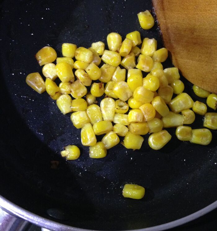 ①フライパンにバターを入れ溶けたところで冷凍コーンを加え、コーンに薄っすら焦げ目が付くまで炒めます。