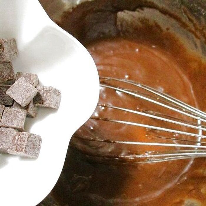 ③油を加え、混ぜ合わせ、製菓用のキューブチョコを混ぜ合わせます