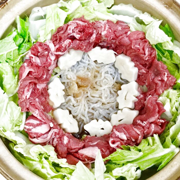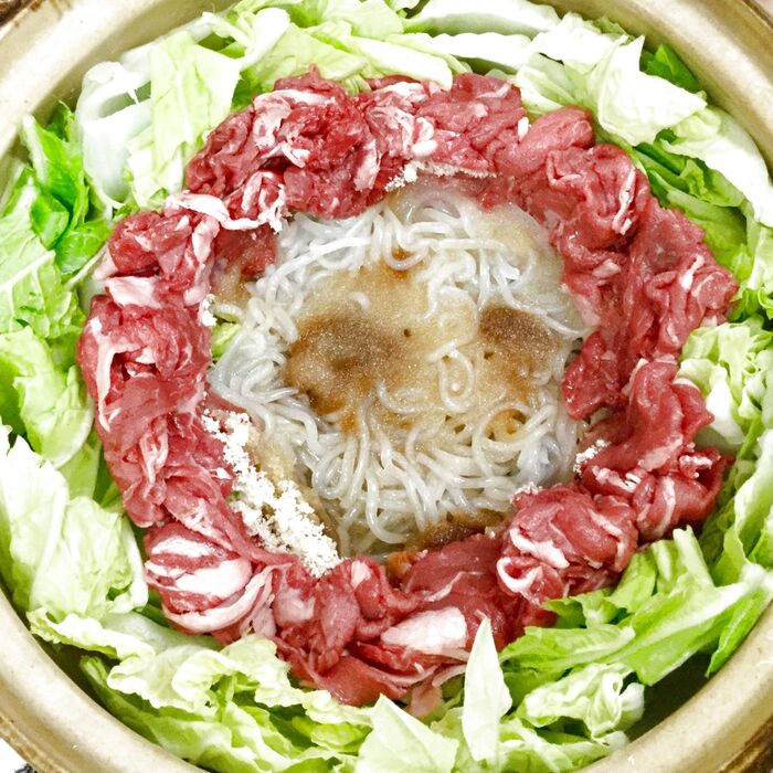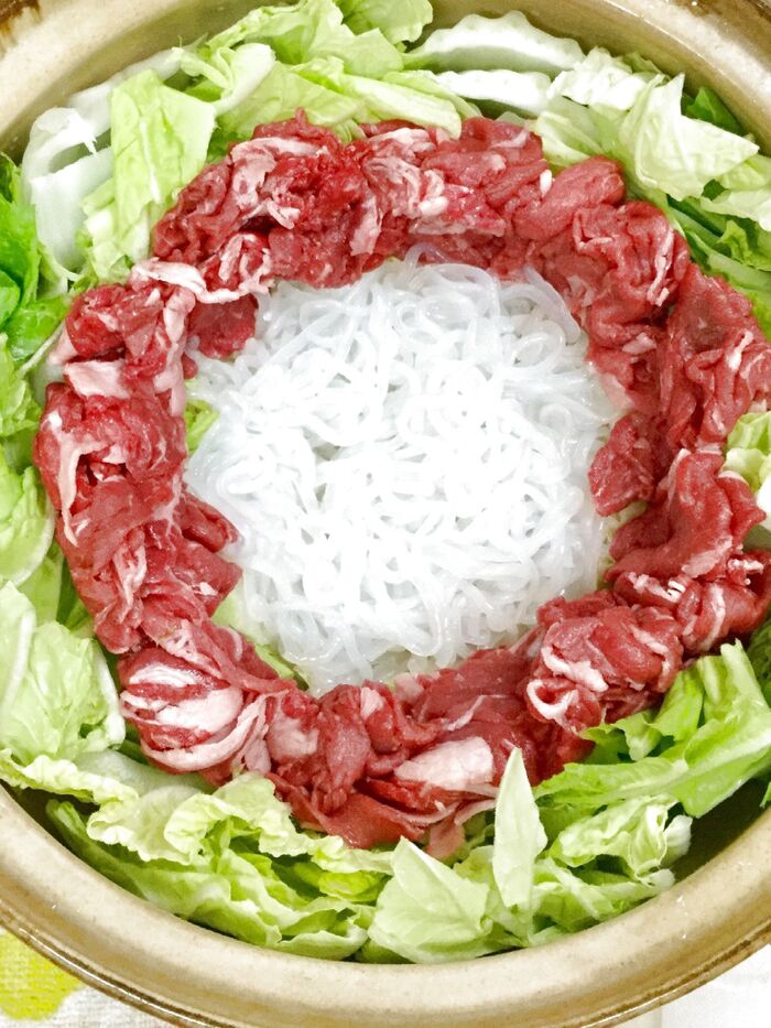 土鍋に、白菜と一度湯がいた白滝を写真のように入れます。