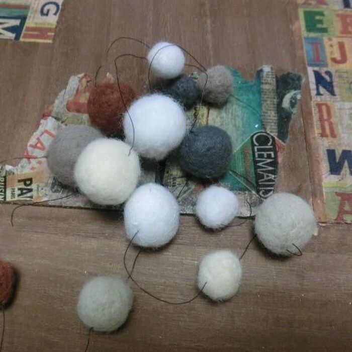 断捨離中に出て来た、もういつ買ったのかも???のフェルトボールの飾りを巻き付けていきます。