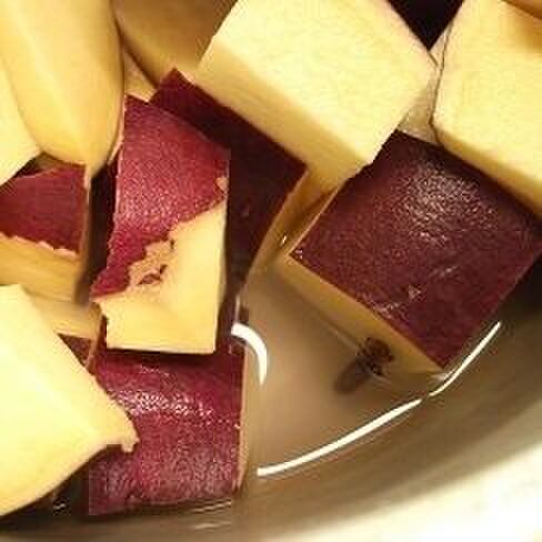 薩摩芋はよく洗って、皮付きのまま2cm角くらいに切る。