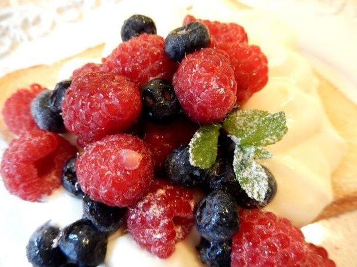 マスカルポーネクリームふんわりとのせベリー類 ミントの葉を添え粉砂糖をふる