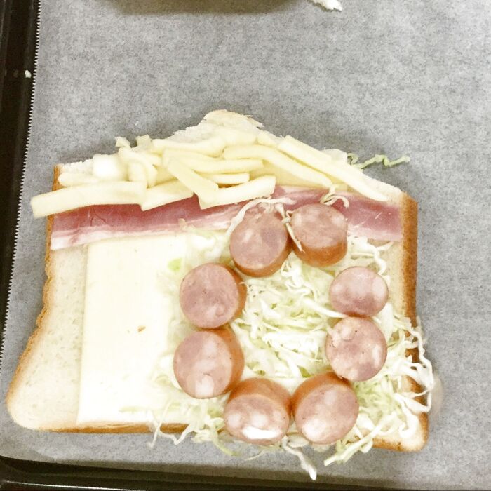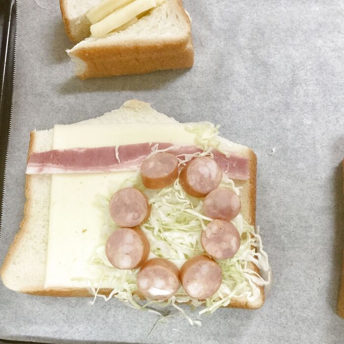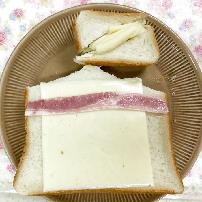おうち部分の食パンに、ベーコンをおきます。