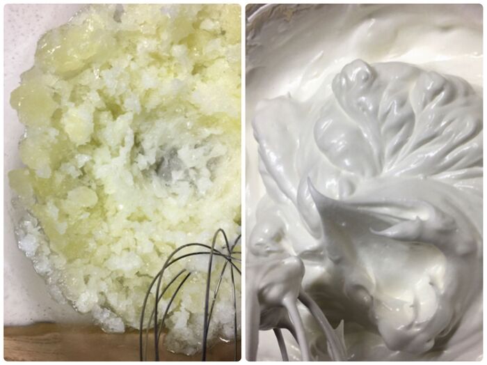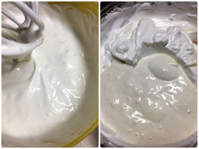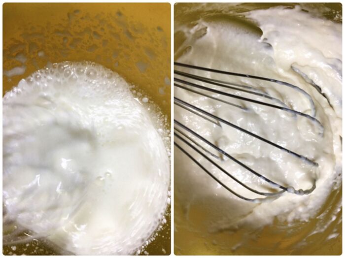 冷凍卵白を解凍させ砂糖を加えてピンとツノが立つまで泡立てる
