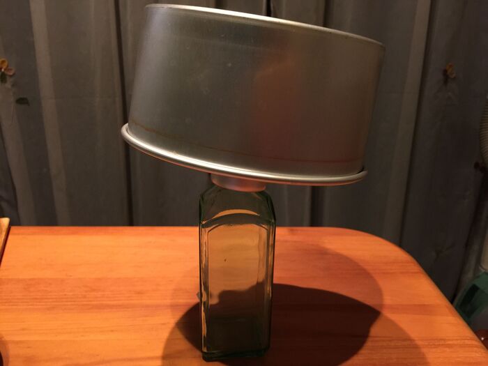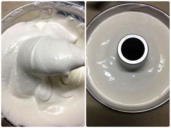 ⑤180度に予熱したオーブンを170度に下げ 35〜40分くらい焼いたら (一度膨らんだシフォンが少し下がってきた頃)ビンなどに刺して逆さまに冷まして出来上がりです。