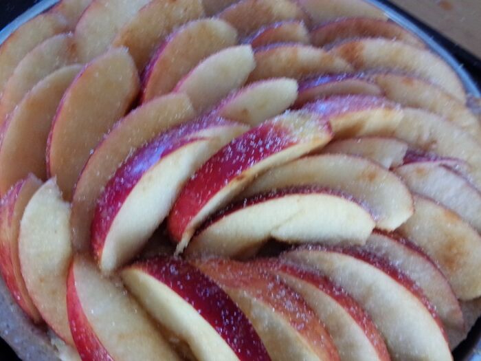 四つ割りにして種を取りシナモン、ブラウンシュガー、レモン汁を塗しておく。