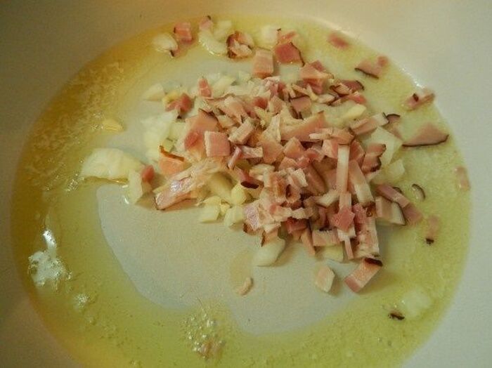 にんにくはみじん切りに玉ねぎ ベーコンはあらみじんに切りにしてフライパンにバターを入れよく炒める