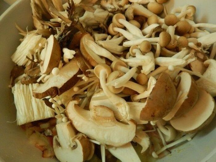 玉ねぎが透き通ってきてニンニク ベーコンの香りがしてきたらきのこ類を加える