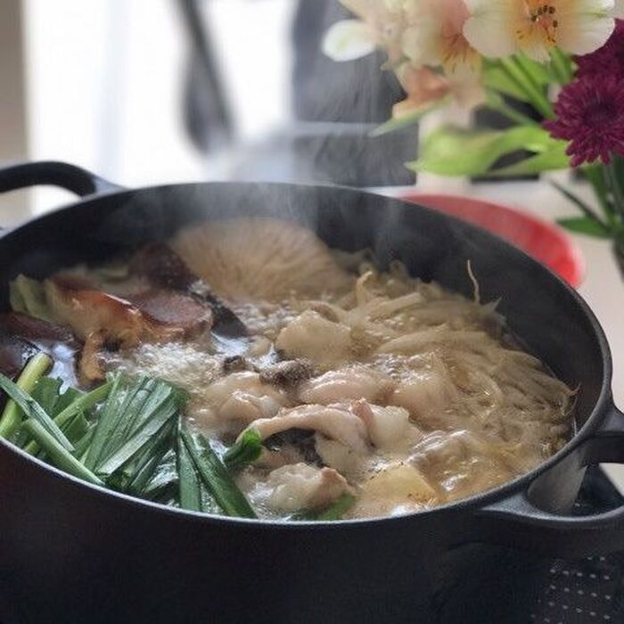 ③味噌、オイスターソース、豆板醤を入れ、牛ホルモンを入れて煮込み、仕上げにニラと豆腐を入れて、味を見て足りなければ調味して、食卓のコンロなどに移して、温めながらいただきます。