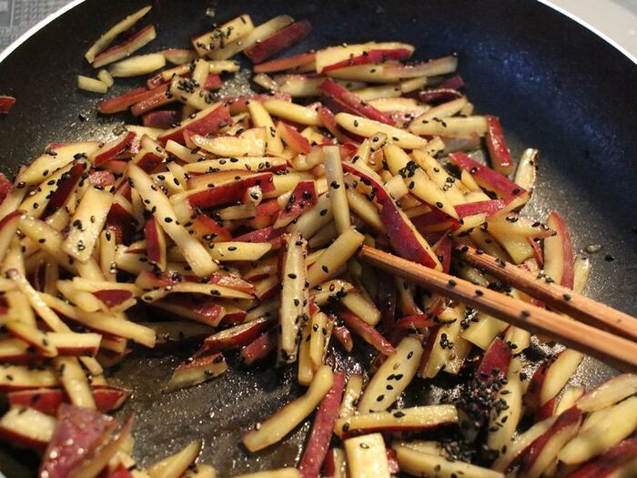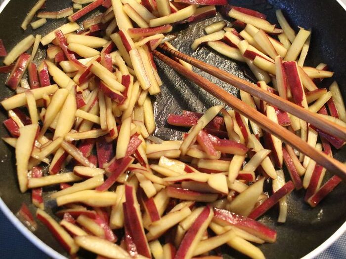 フライパンに油を入れて熱し、水切りしたさつま芋の皮を中火で炒める。