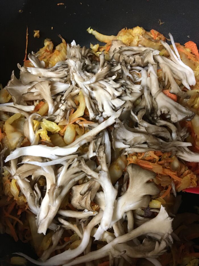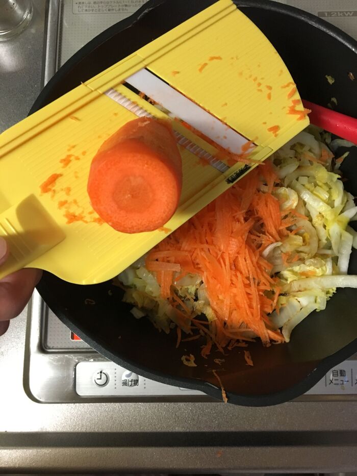 白菜を炒め、しんなりしてきたら人参を加えて炒めます。