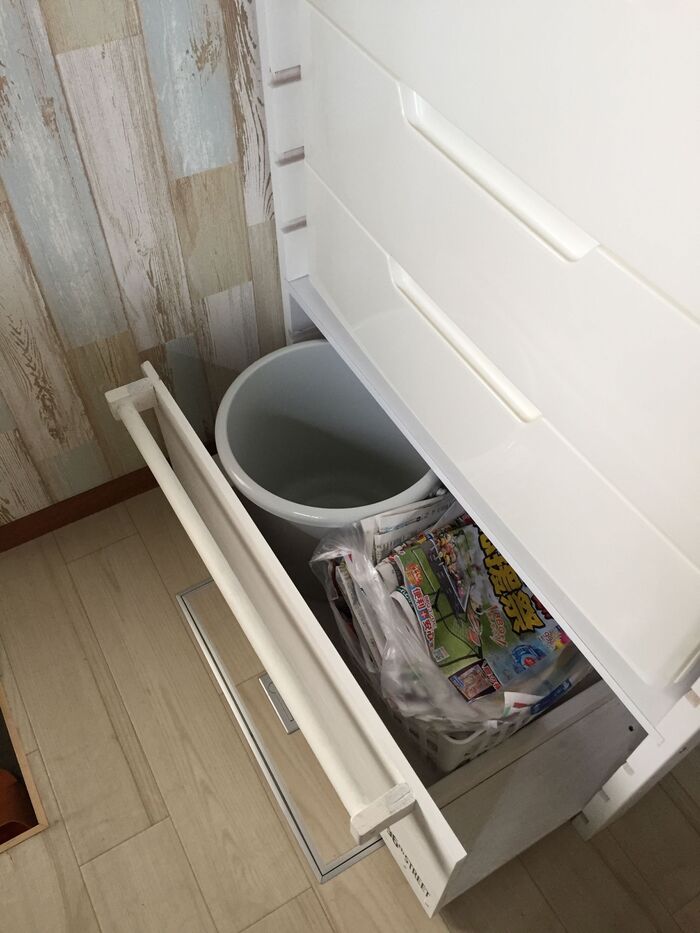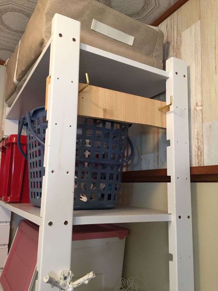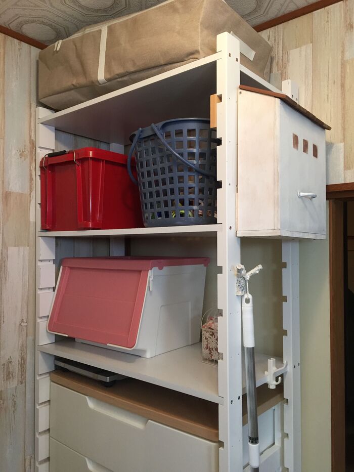 システム収納と記載しているのですが実は上の部分も洗濯カゴや、使わない洗濯ハンガーをニトリの収納に入れて1番上に置き
