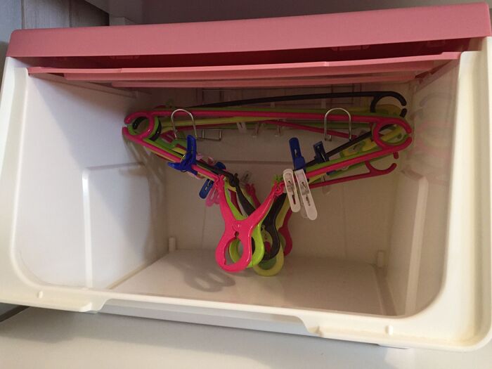 ハンガーも埃をかぶるのが嫌で、カバコのMサイズに100均のハンガーを上下反対にして入れると丁度入ります。