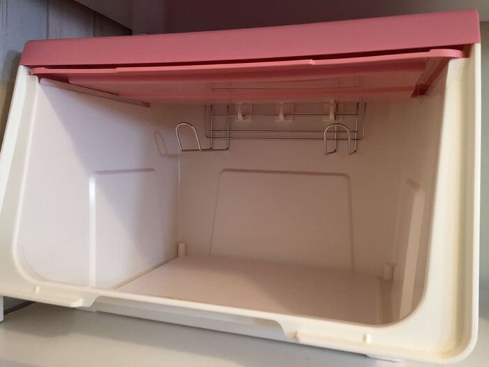 前に洗面台の上に置いていたものですが、リフォームして洗面台の上に置けなくなってサイドが目隠しがわりにもなるのでL字のネジフックを取り付け引っ掛けるようにしています。