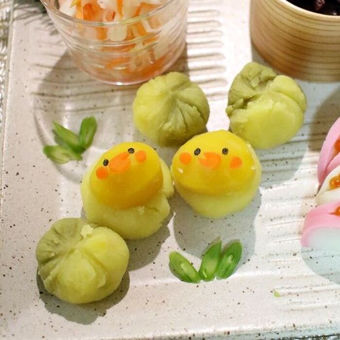 茶巾状にしたきんとんに栗を乗せる。