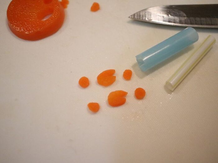 ゆで人参を大小のストローで抜いて、大には切込を入れてクチバシに見立てる。