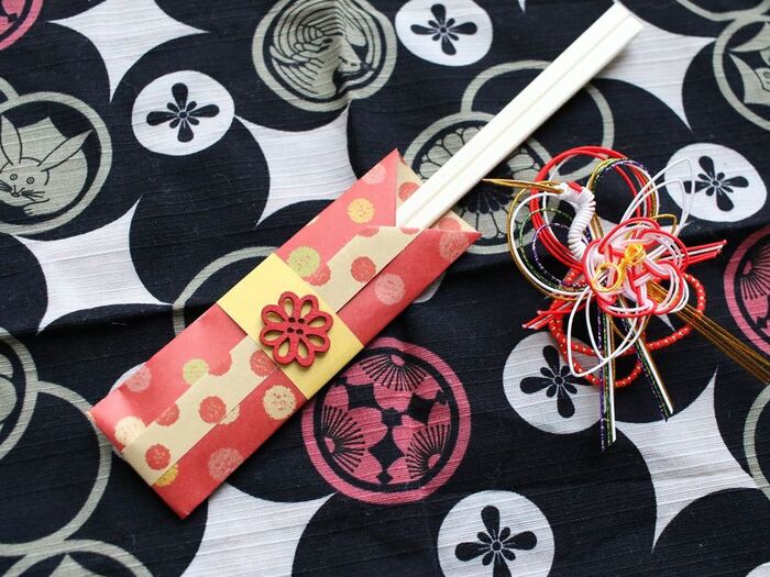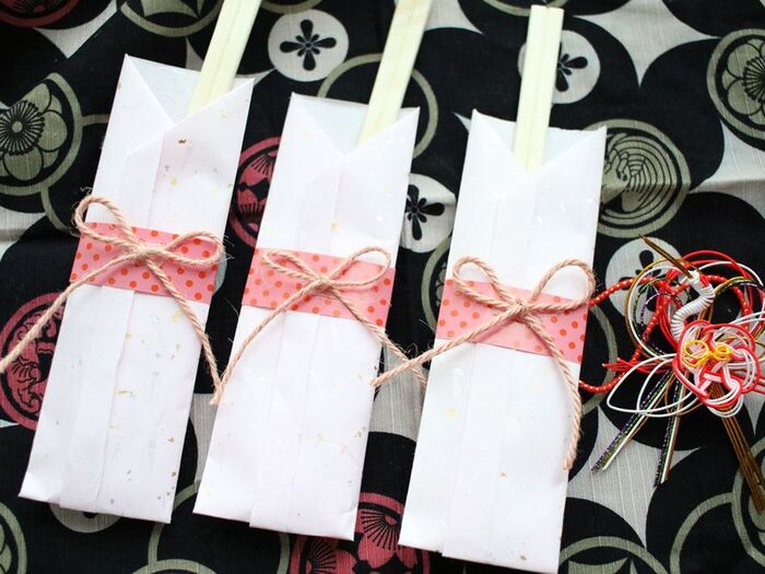 帯状にカットした折り紙を帯に見立てお好みで飾りを付けて完成!(資材に合わせてボンドやのり、テープを使ってください。)