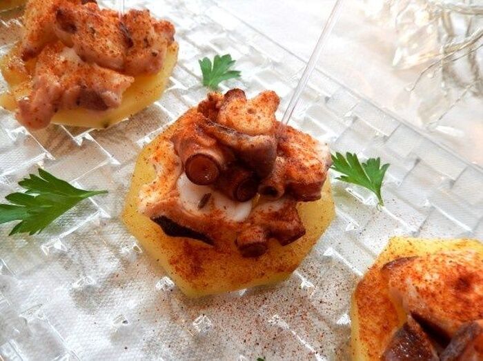 ジャガイモを器に盛りつけその上にタコをのせパプリカをたっぷりとふる