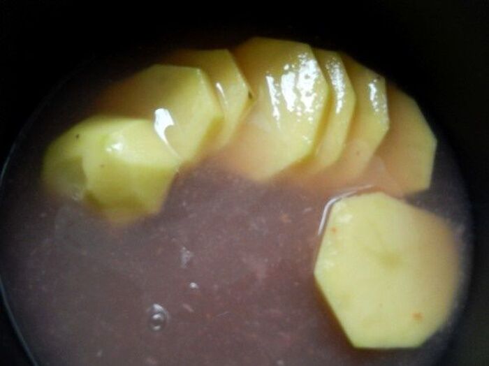 タコを茹でた汁で8mmの厚さに切ったジャガイモを茹でる