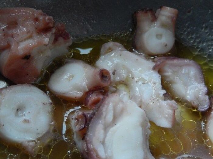 茹でたタコを適当な大きさに切り 茹で汁大さじ2とオリーブオイル大さじ1を入れよく混ぜ 塩気が足りないようなら加え味を調える