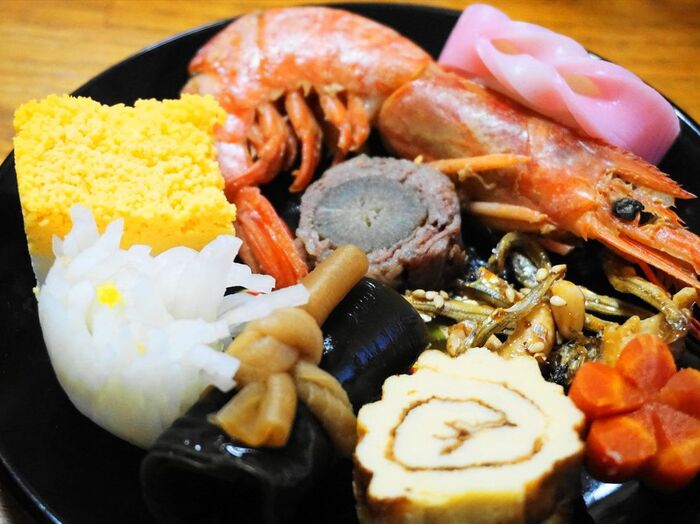 焼き豚、二色卵、八幡巻き、ぶりの照り焼き、伊達巻、田作り