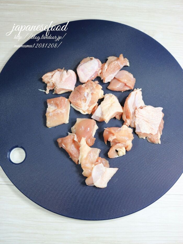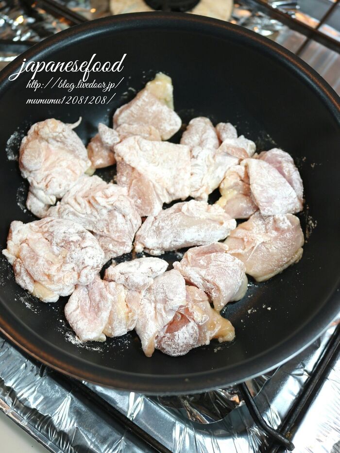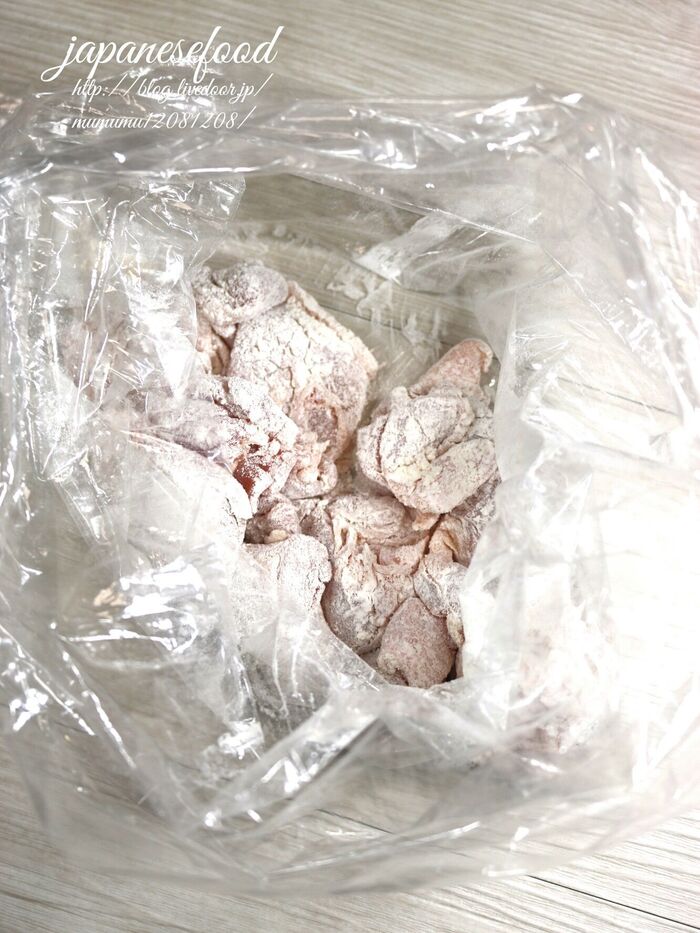 ビニール袋に切っておいた鶏モモ肉を入れて、小麦粉を入れてシャカシャカとふる。
