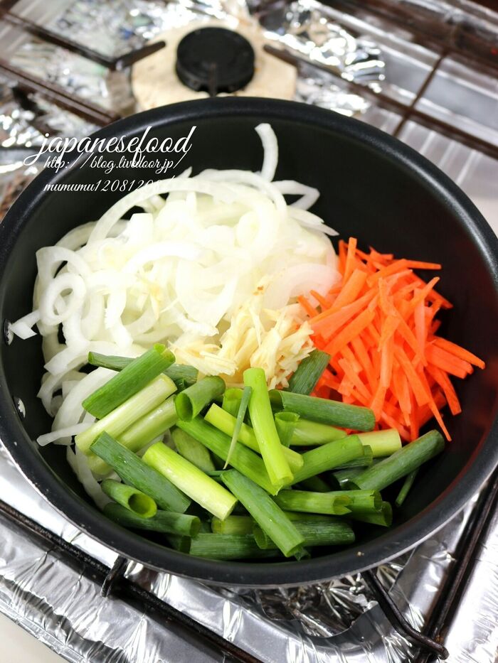 にんじんは千切り、玉ねぎは繊維に逆らって薄切り、葱も5センチ位に切り、生姜も千切りにする。