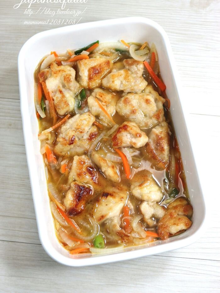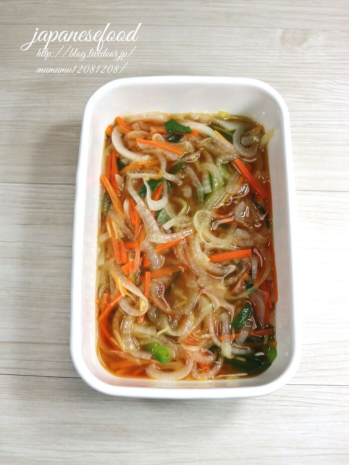 炒めた野菜は付け汁を入れた保存容器に入れる。