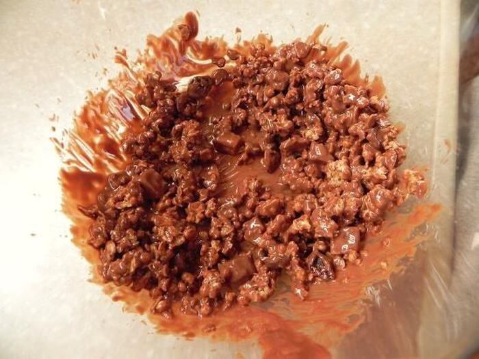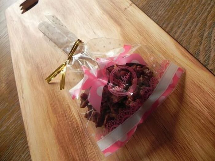 チョコレートを細かくして湯せんで溶かし、グラノーラと混ぜ合わせます。