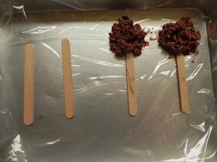 ラップを敷いた上に棒を置き、棒の1/4位にかかるようにチョコグラノーラを乗せます。