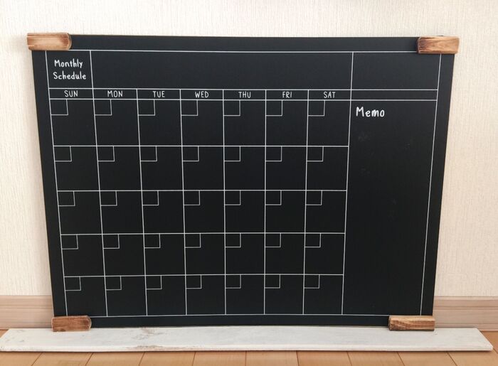 面倒くさがりの私は、その内スケジュールを書き込まなくなってしまいそうなので…、子ども達も届く高さに掛け、子ども達でもスケジュールを書けるようにしました。
