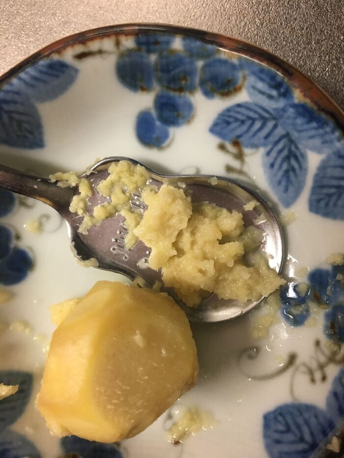 器にスープをよそったら擦りおろし生姜をお好みだけ入れます。