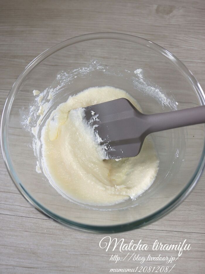 ボウルにクリームチーズを入れてクリーム状になるまで練る。